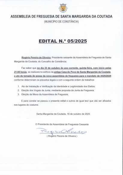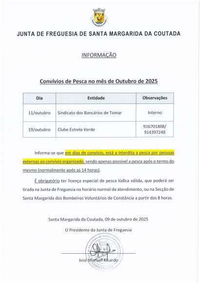 21-OUT-2025Aviso às populações -José Manuel Ricardo, Presidente da Junta de Freguesia de Santa Margarida da Coutada, torna público, que vão realizar-se no Polígono de Tiro da Brigada Mecanizada no dia 21 de Outubro, das 08h30 às 18h00, Fogos Reais e no dia 23 de Outubro, das 07h00 às 15h00, Pista Individual de Combate do 144º Curso de Comandos, no Vale da Coruja.Informa-se assim, que vão ser vedados todos os movimentos dentro e para o interior da referida Zona e não devem levantar, deslocar ou mexer em qualquer granada ou engenho explosivo que porventura seja encontrado, devendo sinalizá-lo e comunicar a sua existência às autoridades militares.